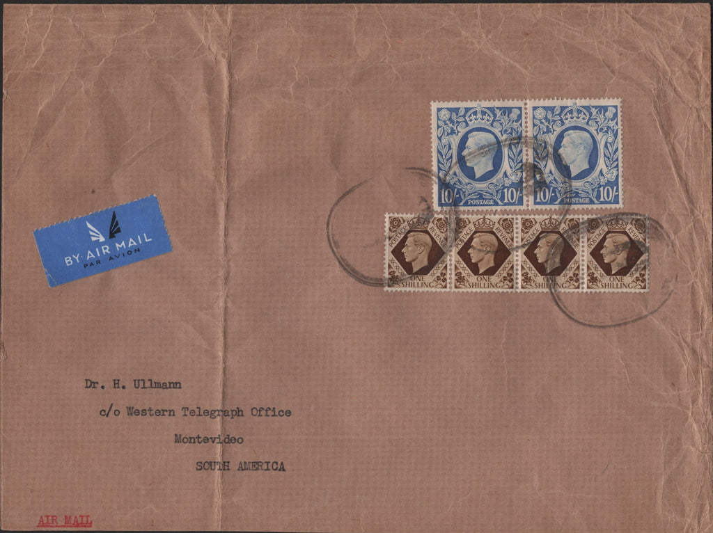 UNDATED ENVELOPE, CIRCA 1950 AIR MAIL LONDON TO MONTEVIDEO, URUGUAY WITH 1S BISTRE-BROWN X 4 AND 10S ULTRAMARINE (SG478b) X 2. Large part envelope, small part removed at left, 218 x 162mm, air mail from London to Montevideo with strip of four 1s bistre-brown (SG475) and very fine pair 10s ultramarine (SG478b) with light strikes oval cancellation, presumably from London. A pity undated but a very rare and attractive franking. (Ref 141232).