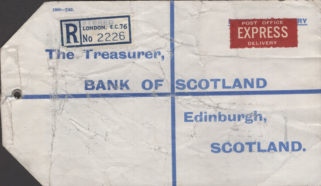 1953 'HVP' REGISTERED EXPRESS PARCEL TAG LONDON TO EDINBURGH WITH KGVI 5S RED (SG510) AND 10S ULTRAMARINE (SG511). Used cloth 'HVP' printed parcel tag sent registered express mail from London to 'The Treasurer, BANK OF SCOTLAND, Edinburgh, SCOTLAND', on reverse KGVI 6d purple (SG470) also KGVI high values 5s red (SG510), 10s ultramarine (SG511) and 1s bistre-brown QEII Wilding with heavier strike 'REGISTERED' London oval date stamp 16 DEC 53. Some creasing as usually seen on all HVP mail, a rare franking with the 10s. (Ref 141249).