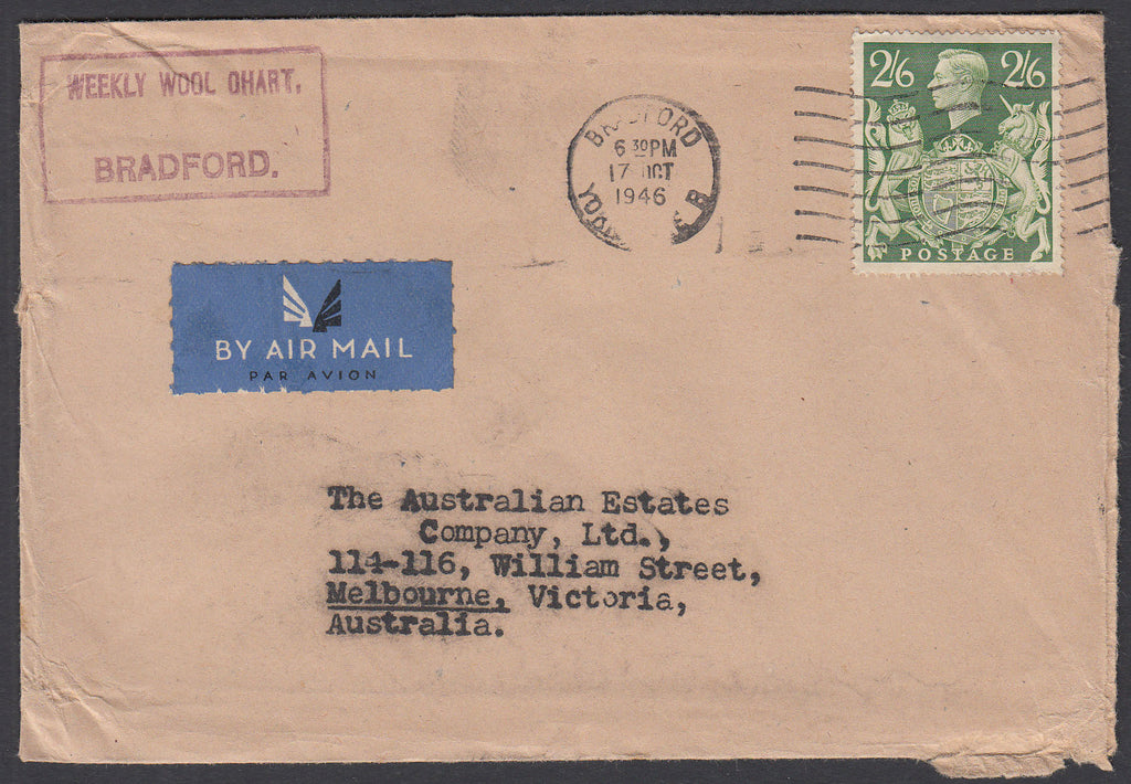 1946 MAIL BRADFORD (YORKS) TO AUSTRALIA 2/6D YELLOW-GREEN (SG476b). Envelope at Bradford, Yorks to Melbourne, Australia with fine KGVI 2/6d yellow-green (SG476b) cancelled BRADFORD 17 OCT 1946. (Ref 86256).