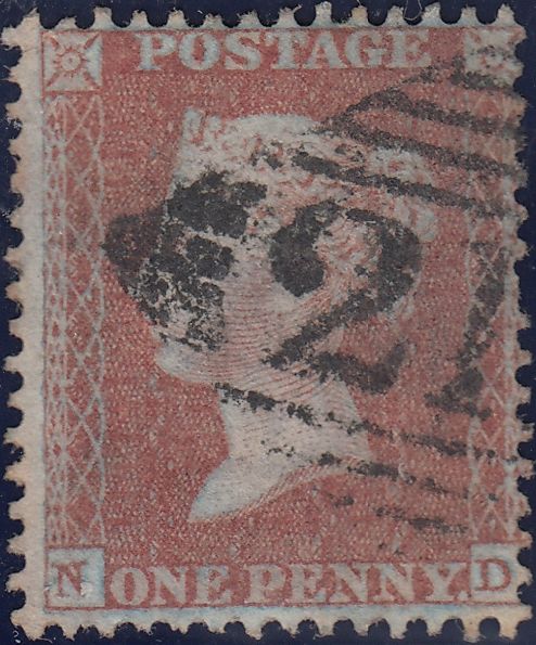PL.14 (ND)(SPEC C6). Good used 1855 die 2 1d pl.14 L.C.14 (Spec C6) lettered ND, one short perforation, Irish cancellation. PRINTED ON VERY BLUED PAPER. Ref 113886).
