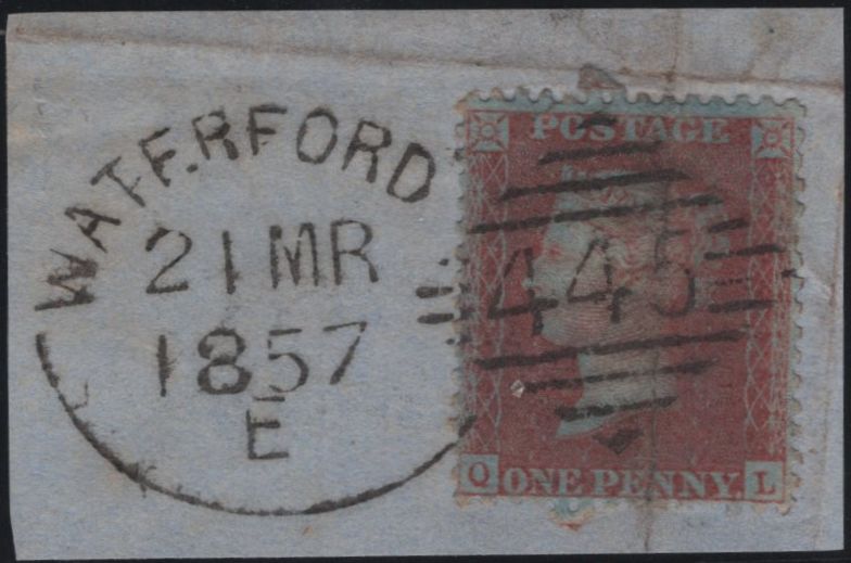 1857 SMALL PIECE 'WATERFORD/445' IRISH TYPE SPOON (RA59). Small piece with fine strike 'WATERFORD/445' Irish type spoon cancellation (RA59) on good used 1d red-brown on blued paper (SG29) lettered QL, vertical crease affects, 21 MR 1857 code 'E'. (Ref 141148).