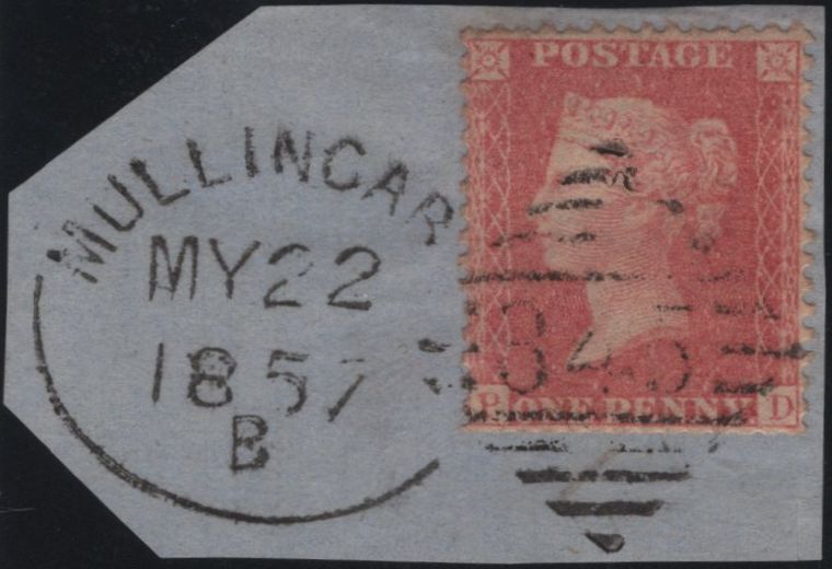 1857 SMALL PIECE 'MULLIGAR/345' IRISH SPOON. Co. WESTMEATH. Small piece fine Die 2 1d pale red on transitional paper (Spec C9(3) lettered PD several short perforations at top, tied fine strike 'MULLINGAR/345' Irish spoon (RA43) MY 22 1957 code 'B'. (Ref 141153).