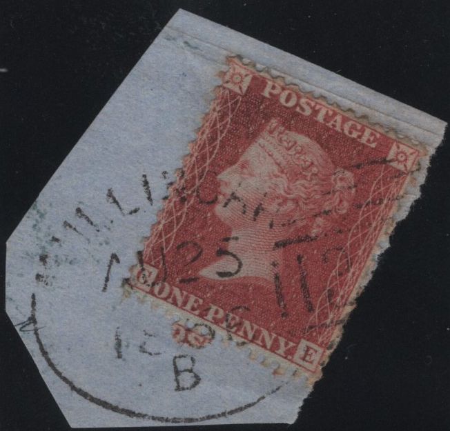 1856 SMALL PIECE 'MULLIGAR/345' ENGLISH TYPE IRISH SPOON (RA42) Co. WEST MEATH. Small piece fine Die 2 1d red-brown on blued paper (SG29) lettered CE tied good part strike 'MULLINGAR/345' English type Irish spoon (RA42) AU 25 1856 code 'B'. Month unrecorded by Arundel. (Ref 141157).