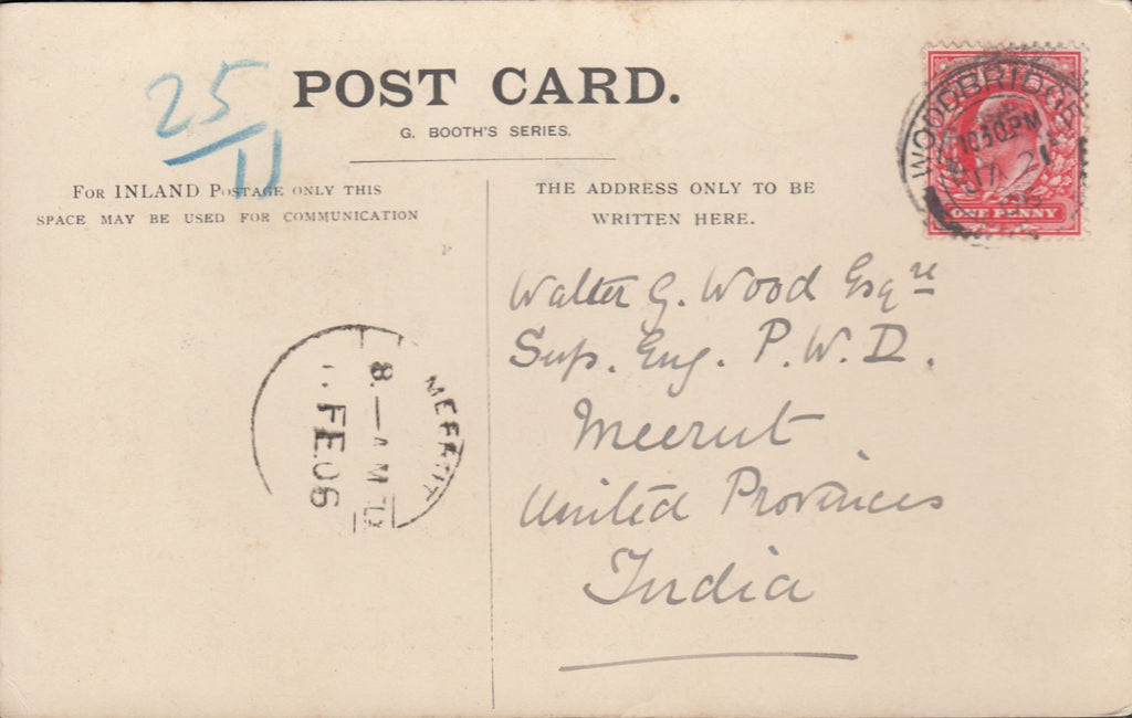 1906 MAIL WOODBRIDGE TO INDIA. Fine post card Woodbridge to Meerut, United Provinces India with KEDVII 1d cancelled WOODBRIDGE JA 21 06 with MEERUT receiver. (Ref 117451).