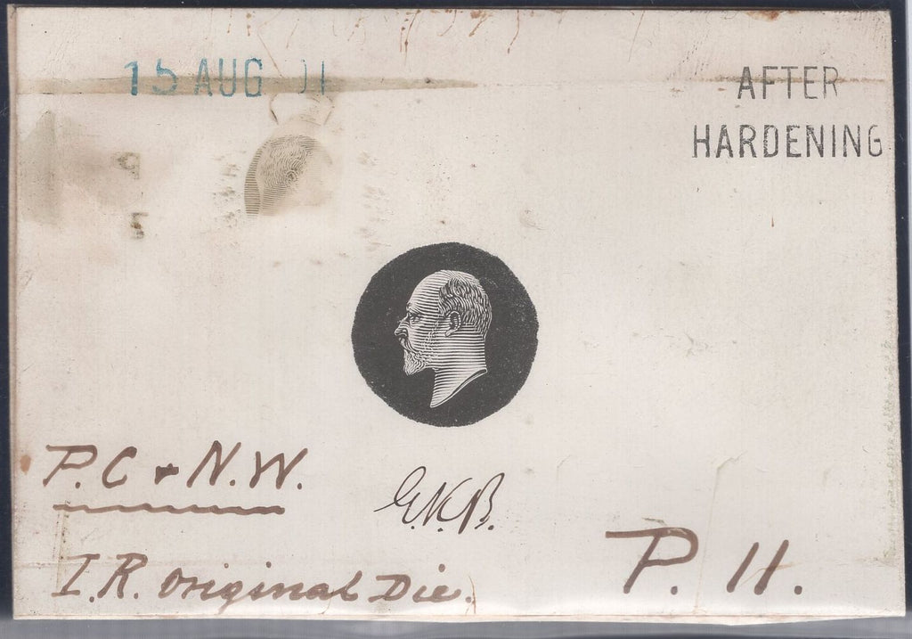 1901 INLAND REVENUE KING EDWARD VII HEAD DIE PROOF. A good to fine die proof in black on white glazed card of the head of King Edward VII, 89 x 60mm, at upper left dated '15 AUG 01' in blue, at upper right hand stamp 'AFTER HARDENING' and with various manuscripts including 'I.R. Original Die'. A very rare die proof relating to Official stamps, Ex De La Rue archive, unlisted by SG. (Ref 135637).