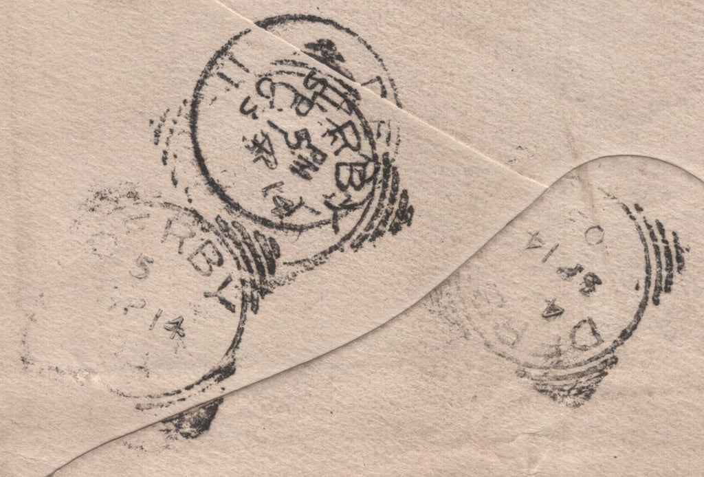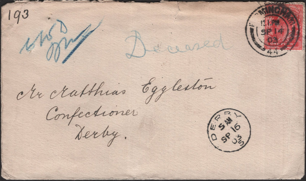 1903 UNDELIVERED MAIL BIRMINGHAM TO DERBY WITH MANUSCRIPT 'Deceased' AND ON REVERSE GOOD STRIKES RARE 'DERBY' SQUARED CIRCLE. Envelope from Birmingham to 'Mr Matthias Eggleston, Confectioner, Derby' with KEDVII 1d scarlet (SG219) cancelled 'BIRMINGHAM' SP 14 03. On front manuscript 'Deceased' and 'DERBY' single ring date stamp SP 16 03. On reverse three good strikes of the rare 'DERBY' squared circle SP 14 03. Ex Grimwood-Taylor collection. (Ref 140968).