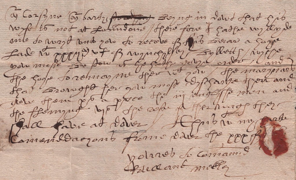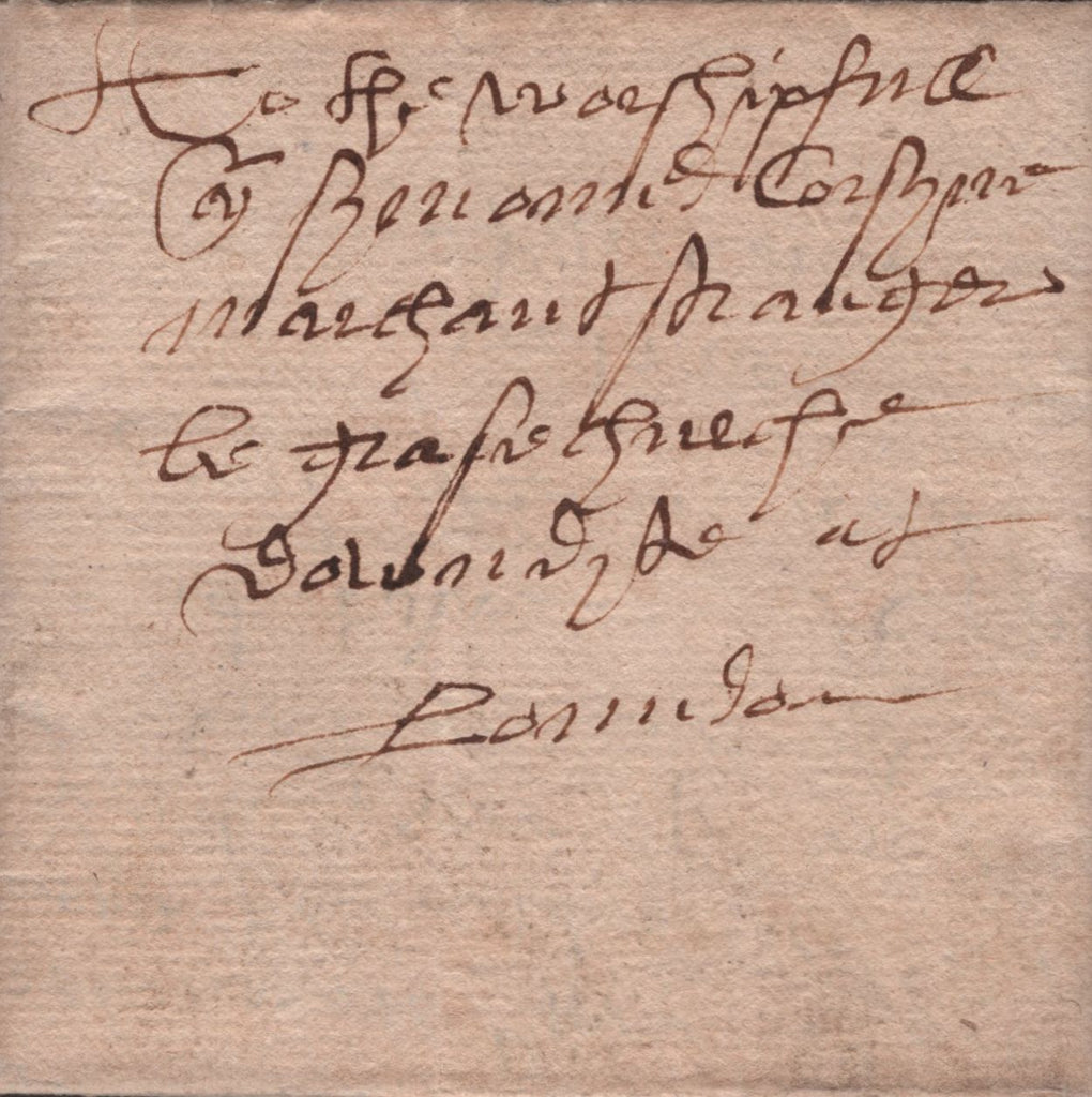 1575 MAIL FROM DOVER TO LONDON, PRIVATELY CARRIED WITHOUT CHARGE OR MANUSCRIPT. Fine letter, apparently from Dover in 1575 written by a C Dugant to 'the worshipful Benandi Corsyne, merchant stranger by Grasse Street conndyte at London' without postal charge or any other manuscript. The letter states 'Barty being in dowt that his wife is not in London, therefore I write to you to receive a hoylanden with 32,000 of Winchelsea billets, which you must bestow has he hath given order. The hoy to remain with you the mariners you must give 3s each, the Englshmen 6s each, the Flemmings, the rest of their wages they shall have at Dover.' Ex the personal collection of Robson Lowe. (Ref 141845).