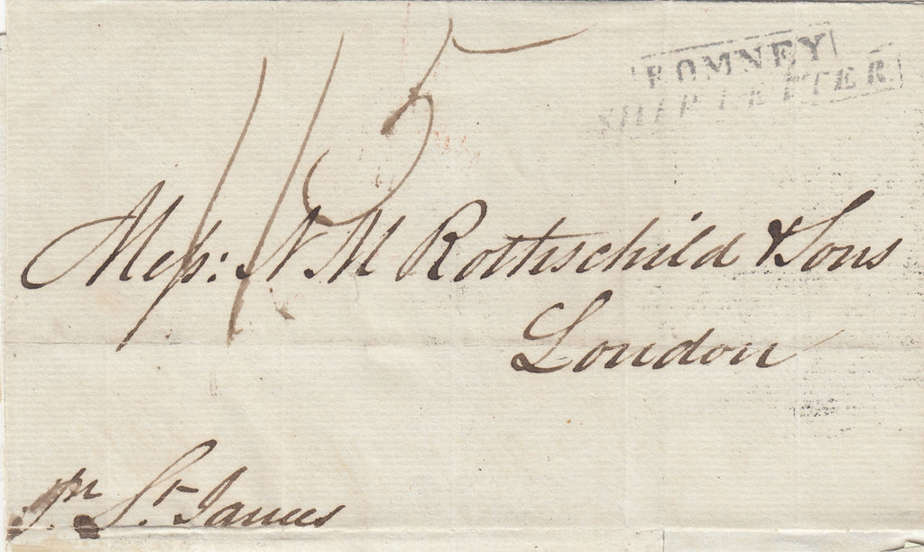 1838 MAIL NEW YORK TO LONDON WITH 'ROMNEY/SHIP LETTER' (Rob S3) AND 'GILPIN'S' FORWARDING CACHET. Wrapper, small fault lower right, New York to London via Romney endorsed 'Pr St. James', charged '1/5' and on front good to fine strike of the step type 'ROMNEY/SHIP LETTER' handstamp in black (Rob S3). On reverse fine strike of the large oval 'FORWARDED THROUGH GILPINS EXCHANGE/READING ROOM AND FOREIGN LETTER OFFICE N.YORK' cachet and London date stamp 28 JA 1839. (Ref 142622).