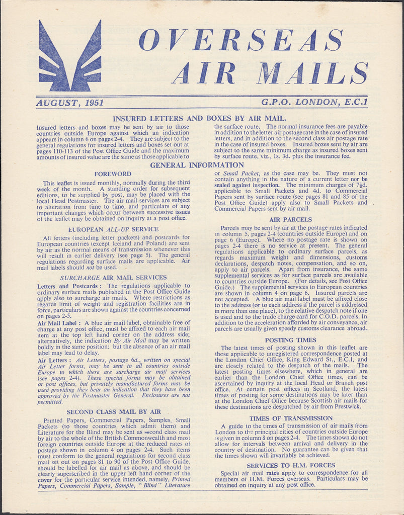 1951 'OVERSEAS AIR MAILS' G.P.O. PAMPHLET. A fine six page pamphlet dated August 1951 with excellent information on Air Mail services including 'SURCHARGE AIR MAIL SERVICES TO COUNTRIES OUTSIDE EUROPE', 'ALL-UP SERVICE TO EUROPE', 'SURCHARGE AIR MAIL SERVICES TO POLAND AND ICELAND', and 'AIR PARCEL SERVICES TO EUROPE'. (Ref 119404).