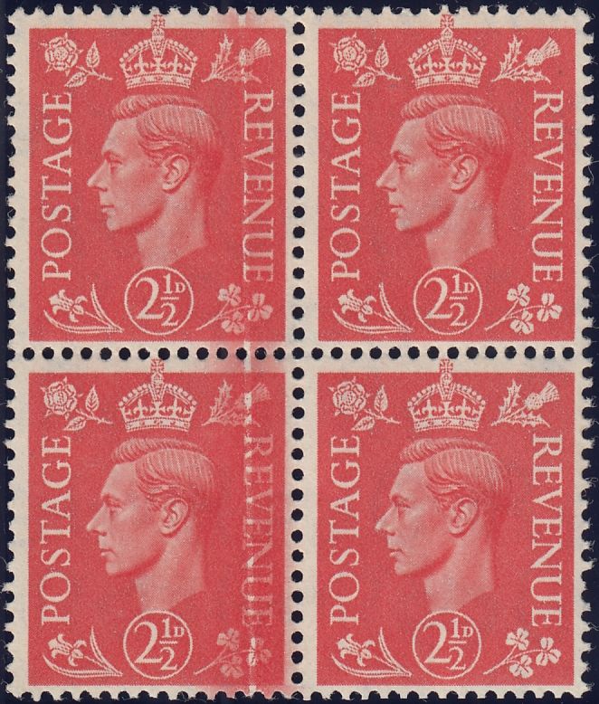 1951 2½D PALE SCARLET (SG507) DR BLADE FLAW. A fine unmounted o.g. block of four 1951 2½d pale scarlet (SG507), two stamps at left showing good to fine DR BLADE FLAW. (Ref 125716).