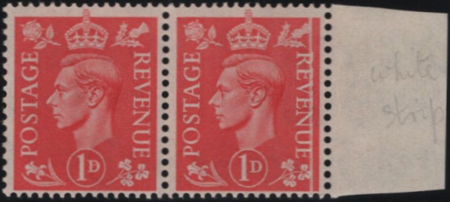 1941 1D PALE SCARLET (SG486) HORIZONTAL PAIR WITH DR. BLADE FLAW. Fine o.g. right marginal horizontal pair 1941 1d pale scarlet (SG486), right hand stamp fine DR. BLADE FLAW, large part o.g. (Ref 138620).