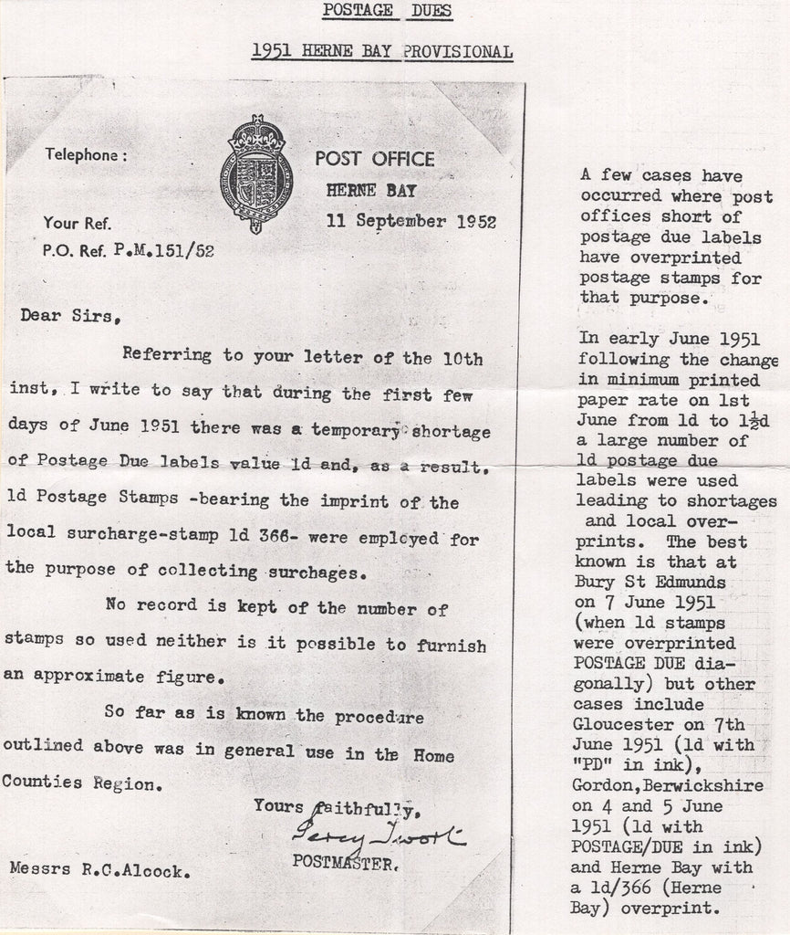 • 141247 1951 1D LIGHT ULTRAMARINE (SG504) HERNE BAY '1D/366' POSTAGE DUE PROVISIONAL.