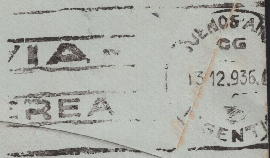 1936 AIRMAIL LONDON TO BUENOS AIRES, ARGENTINA 2/6 SEAHORSE (SG450) PAIR 9D (SG447). Envelope sent airmail London to Buenos Aires, Argentina, with fine 2/6 Seahorse (SG450) and pair 9d photogravure (SG447) 'LONDON' cancellation 7 DEC 36. (Ref 142084.)