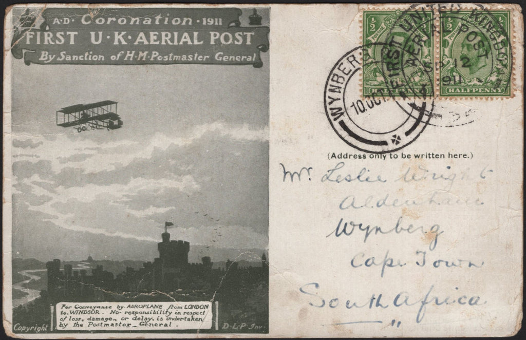 1911 FIRST U.K. AERIAL POST LONDON POSTCARD IN OLIVE-GREEN TO CAPE TOWN, SOUTH AFRICA. Used London postcard in olive-green from London to 'Mr Leslie Wright, Aldenhall. Wynberg, Cape Town, South Africa' with pair KGV ½d Downey tied fine strike 'FIRST UNITED KINGDOM/AERIAL POST/LONDON' date stamp SP 12 1911, die 3 and alongside 'WYNBERG CAPE' date stamp 10 0CT 11. Some creasing and slight staining. Message reads 'I think you will be one of the first in South Africa to get a letter that has gone part of the way by Aeroplane'. (Ref 142087).