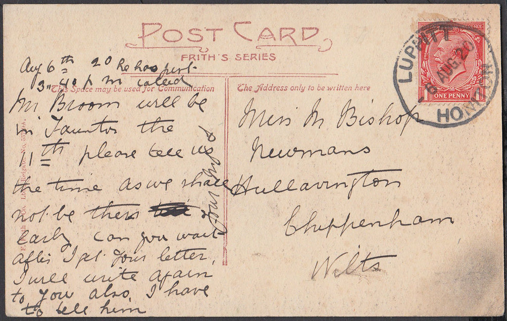 DEVON. 1920 post card of Taunton to Chippenham (soiled) with KGV 1d cancelled fine "LUPPITT/HONITON" rubber hand stamp 6.AUG.20.  (Ref 76403).