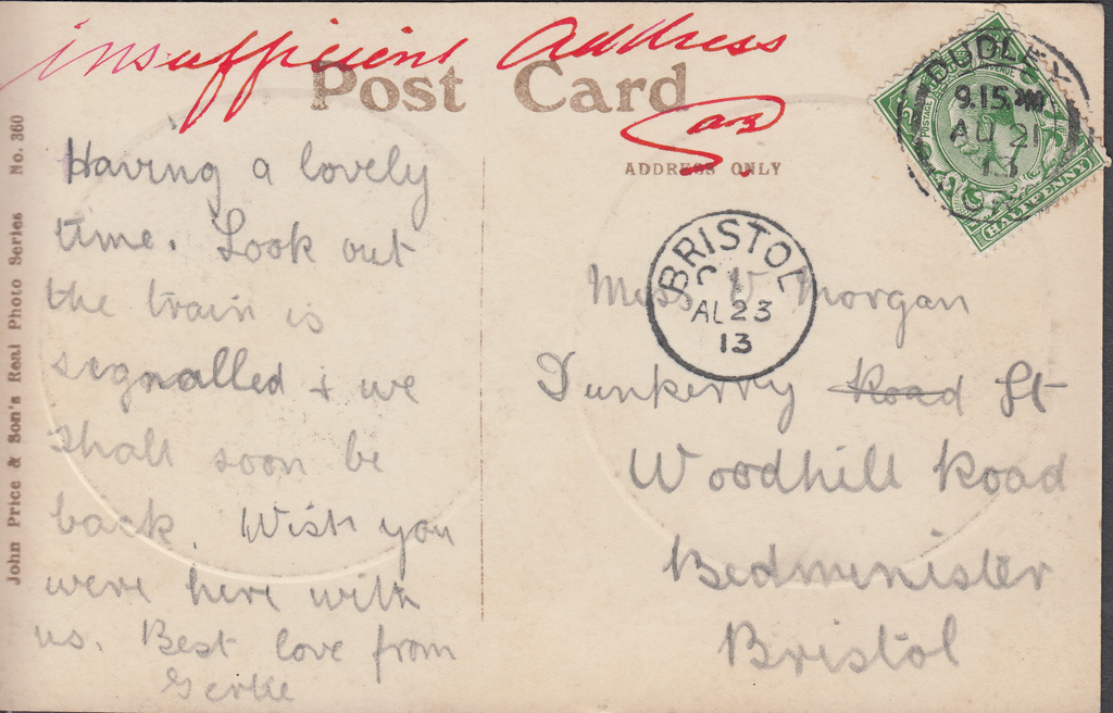 1913 POST CARD DUDLEY TO BRISTOL MANUSCRIPT 'INSUFFICIENTLY ADDRESS'. Post card Dudley to Bristol with KGV ½d cancelled DUDLEY date stamp AU 21 13 with manuscript 'insufficient Address', alongside BRISTOL date stamp AU 23 13. (Ref 86730).
