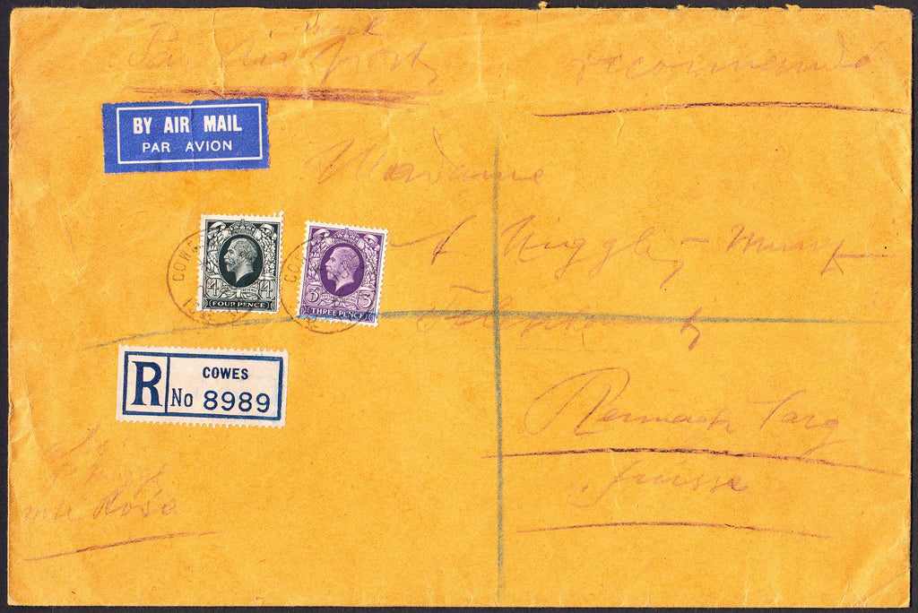 1936 envelope sent registered air mail Cowes to Switzerland with KGV photogravure 4d and 3d cancelled COWES/ISLE OF WIGHT cds's 22.JU.36.  (Ref 91347).