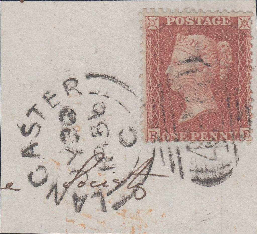 PL.13 (SPEC C6)(RE). Small piece with good used die 2 1d pl.13 L.C.14 (spec C6) lettered RE, several short perforations and tied good strike LANCASTER/436 sideways duplex MY 30 1856 code C. (Ref 118664).