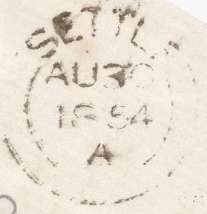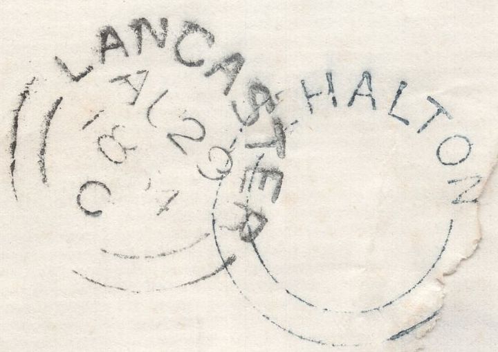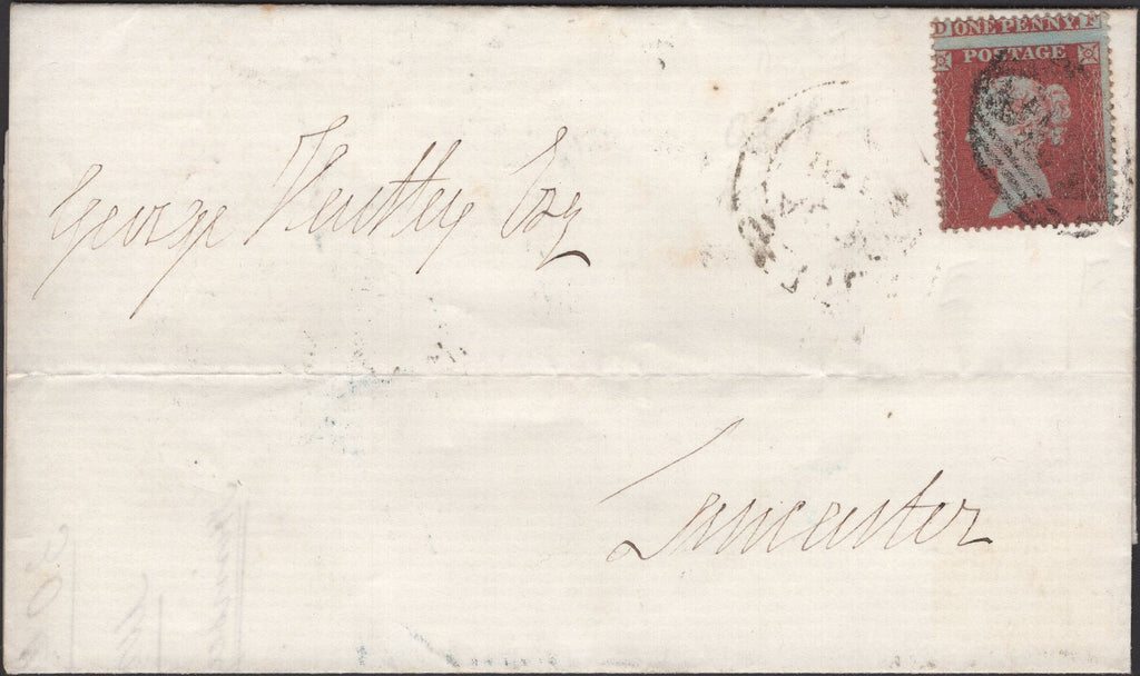 1854 MAIL HALTON, LANCS TO LANCASTER WITH 1D (SG17) AND 'HALTON' UDC. Fine letter from Halton dated Aug 29 54 to 'George Kentley Esq, Lancaster' with die 1 1d S.C.16 (SG17), centred high due to misplaced sheet variety, indistinct cancellation. On reverse good strike 'HALTON' udc in dark blue small part missing, also 'LANCASTER' date stamp AU 29 1854 and 'SETTLE' date stamp AU 30 1854. (Ref 136477).