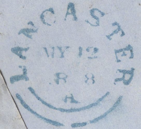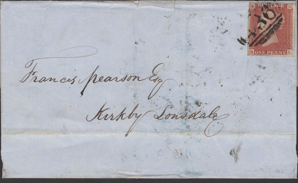 1848 MAIL WRAY, LANCS TO KIRKBY LONSDALE WITH 1D (SG8) 'WRAY' UDC (LA1356). Wrapper from Wray, Lancs to 'Francis Pearson Esq, Kirkby Lonsdale' with fine 1d (SG8) lettered OL with four margins and tied good strike '436' numeral of Lancaster. On reverse very fine strike 'WRAY' udc in blue (LA1356) and 'LANCASTER' date stamp MY 12 1848. Scarce udc. (Ref 136976).