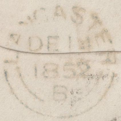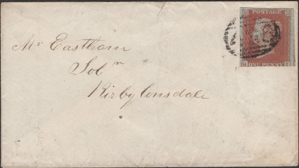 1852 MAIL CARNFORTH, LANCS TO KIRBY LONSDALE WITH 1D (SG8) AND 'CARNFORTH' UDC. Envelope from Carnforth to 'Mr Eastham, Solr, Kirby Lonsdale' with 1d (SG8) lettered QI, touched at foot otherwise good margins and tied '436' numeral of Lancaster. On reverse very fine strike 'CARNFORTH' udc in dark blue and 'LANCASTER' date stamp DE 14 1852. (Ref 137124).