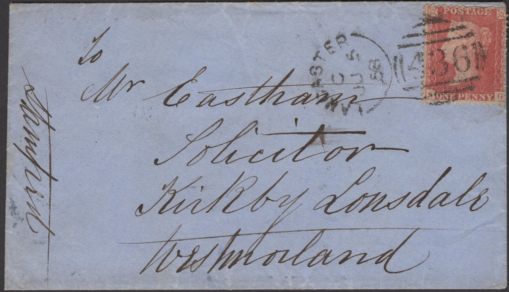 1858 MAIL WRAY, LANCS TO KIRKBY LONSDALE WITH 1D (SG40) AND 'WRAY' UDC (LA1356). Envelope Lancaster to 'Mr Eastham, Solicitor, Kirkby Lonsdale, Westmorland' with fine die 2 1d rose-red on white paper (SG40) lettered SG tied fine strike 'LANCASTER/436' sideways duplex JU 5 58. On reverse good part strike 'WRAY' udc in dark blue (LA1356) and 'KIRBY-LONSDALE' date stamp JU 6 1858. (Ref 137135).