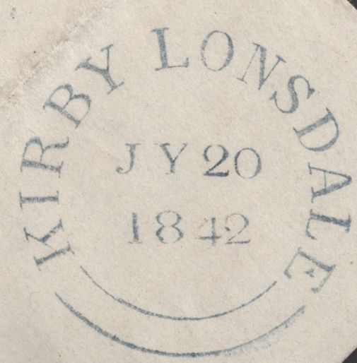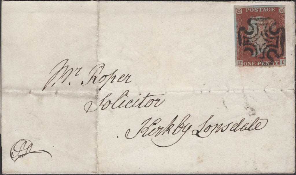 1842 PART WRAPPER HORNBY, LANCS TO KIRKBY LONSDALE WITH 1D (SG8) AND 'HORNBY-LANC' UDC (LA535). 1842 part wrapper, no side flaps, from Hornby to 'Mr Roper, Solicitor, Kirkby Lonsdale' with 1d (SG8) lettered HI, just touched at lower right cancelled fine strike Lancaster Maltese cross. On reverse good strike 'HORNBY-LANC' udc in red (LA535) and 'KIRBY LONSDALE' date stamp in blue JY 20 1842. Filing folds clear of stamp and hand stamps. (Ref 137138).