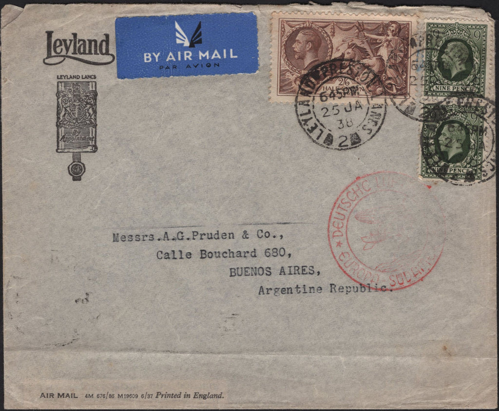 1938 AIR MAIL LEYLAND, PRESTON IN LANCS TO BUENOS AIRES, ARGENTINE WITH 2/6 SEAHORSE (SG450) AND KGV 9D (SG447) X 2. Fine envelope sent air mail Leyland in Lancashire to Buenos Aires, Argentine with fine 2/6 Seahorse (SG450) and vertical pair 9d photogravure (SG447) tied fine strikes 'LEYLAND/PRESTON/LANCS' date stamp 25 JA 38. (Ref 141885).