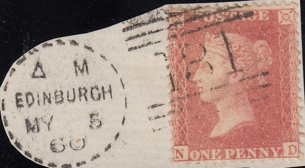 EDINBURGH DOTTED CIRCLE (RA1)/PL.47 (SG40)(ND). Small piece with fine used die 2 1d pl.47 pale rose-red on white paper (SG40) lettered ND, tied fine strike EDINBURGH/131 dotted circle (RA1) MY 5 60 codes triangle M. Month and codes unrecorded by Arundel. (Ref 116099).