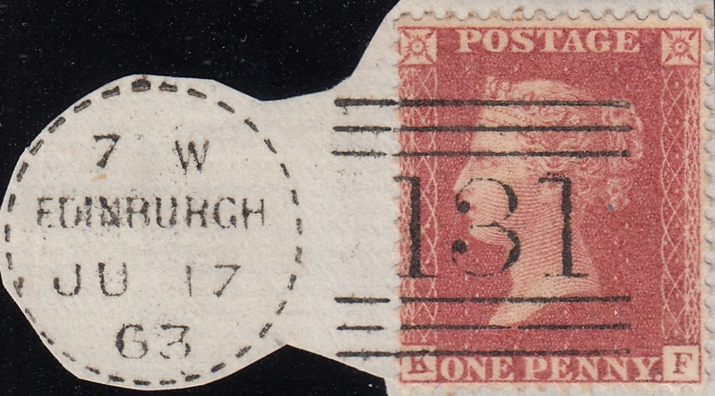 EDINBURGH DOTTED CIRCLE (RA5)/PL.48 (SG40)(KF). Small piece (cut in an irregular shape) with fine die 2 1d pl.48 rose-red on white paper (SG40) lettered KF, tied good strike EDINBURGH/131 dotted circle (RA5) JU 17 63 codes 7 W. Month and codes unrecorded by Arundel. (Ref 116100).