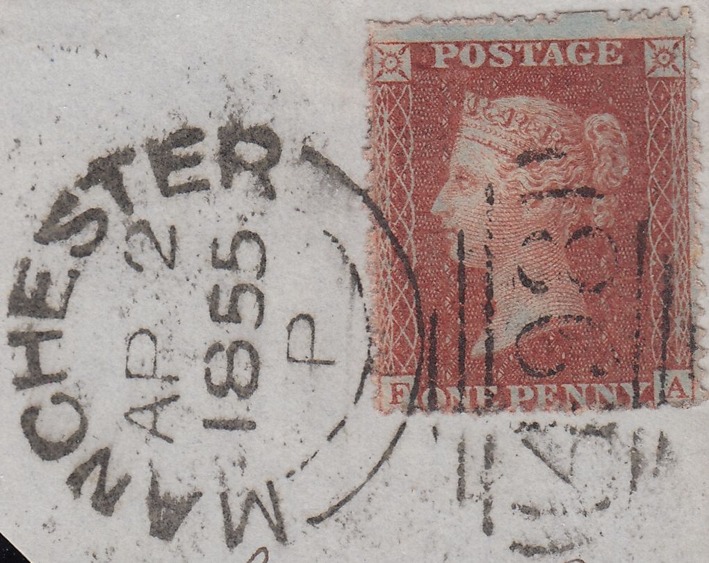 PL.6 (FA)(SG21). Small piece with good used die 2 1d pl.6 S.C.16 (SG21) lettered FA, short perforation at top, tied MANCHESTER/498 sideways duplex AP 2 1855 code P. (Ref 116112).
