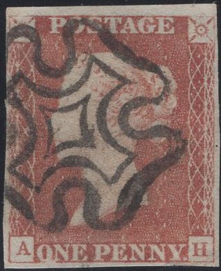 1841 1D RED PL.10 (SG7)(AH). Good used 1841 1d red pl.10 (SG7) lettered AH with four close to fine margins and cancelled fine strike black Maltese cross. Corner bend but stamp shows fine 'O flaw state 3' and 'Squat H'. (Ref 134750).