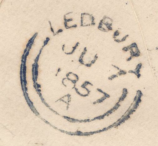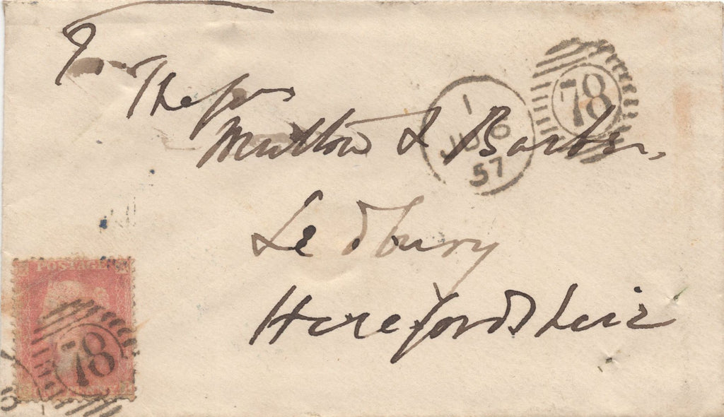 • 134841 1857 MAIL LONDON TO LEDBURY WITH 1D (SPEC C9A(1) WITH 'ISLINGTON-C.O' RECEIVERS HAND STAMP (L514/ISLCO21b).
