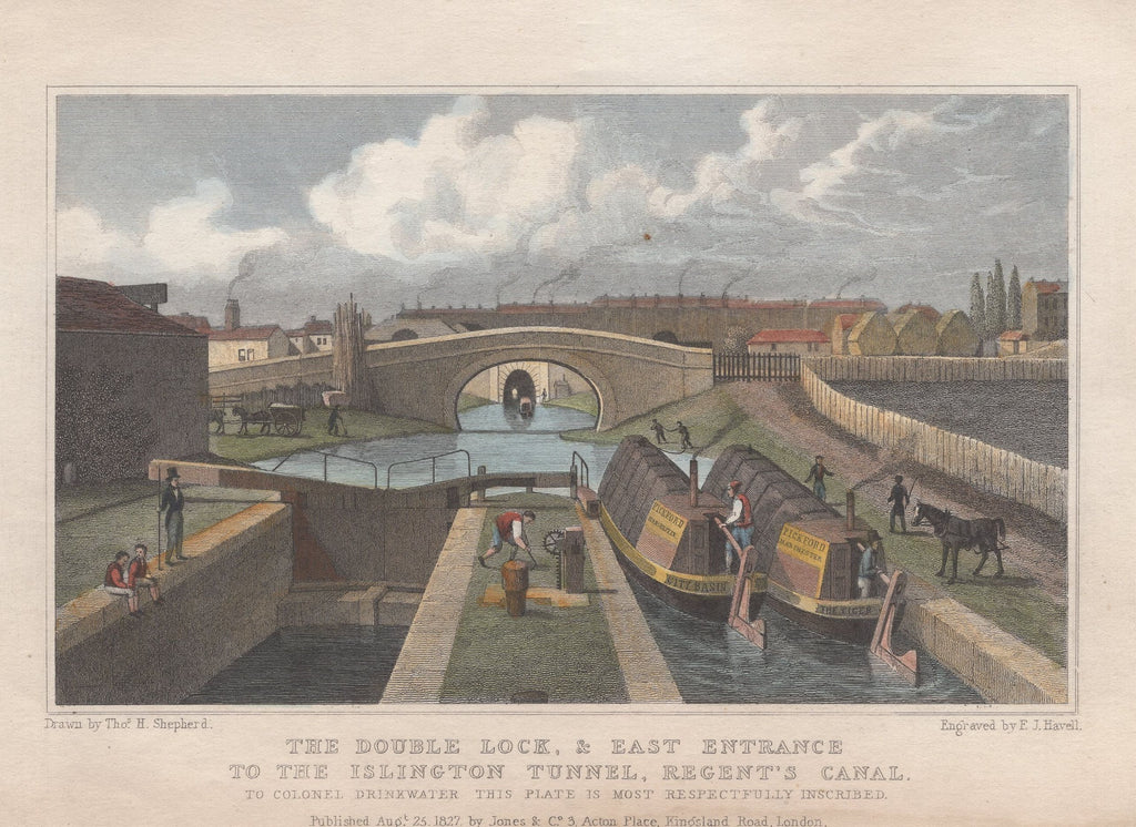 1857 MAIL LONDON TO LEDBURY WITH 1D (SPEC C9A(1) WITH 'ISLINGTON-C.O' RECEIVERS HAND STAMP (L514/ISLCO21b). Envelope London to Ledbury, Herefordshire with die 2 1d pale rose 'SAVOY STREET' printing (Spec C9A(1) lettered GI, corner crease, placed lower left of envelope and tied London '78' duplex JU 6 57 with second full strike at upper right. On reverse very fine strike 'ISLINGTON-C.O' straight line receivers hand stamp in blue (L514/ISLCO21b) and 'LEDBURY' date stamp JU 7 1857. The receivers hand stamp only recorded 1857/58. Also fine coloured contemporary print 'THE DOUBLE LOCK AND ENTRANCE TO THE ISLINGTON TUNNEL, REGENT'S CANAL', 169 x 123. (2 items) ex Michael Champness collection. (Ref 134841).
