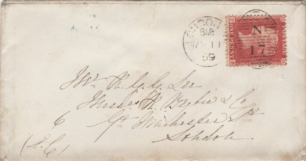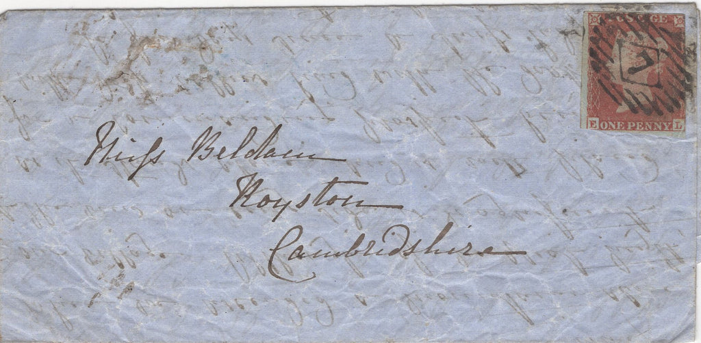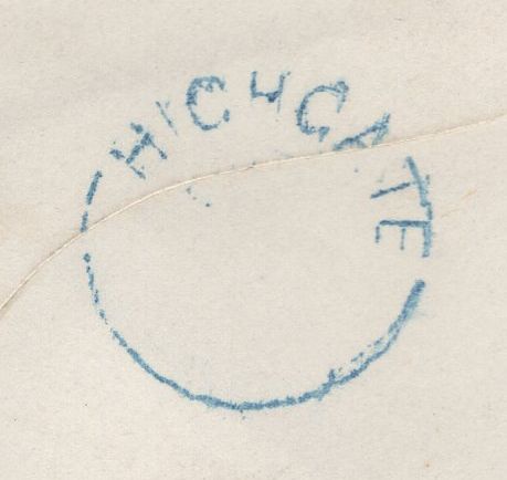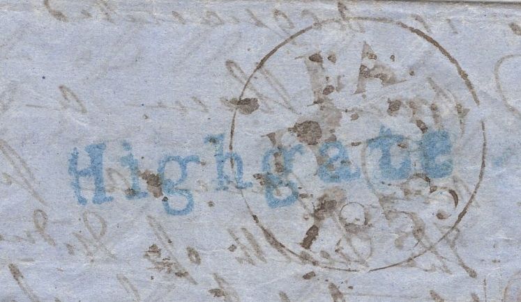 1853 COVER EX SWITZERLAND TO ROYSTON AND 1859 MAIL USED IN LONDON WITH 'Highgate' RECEIVER AND 'HIGHGATE' UDC, BOTH IN BLUE. 1853 letter, some creasing, from Canton de Vaud in Switzerland dated July 22nd (1853) to 'Mifs Beldau, Royston, Cambridgeshire' carried privately to London and put into the mail with 1d (SG8) lettered EL, touched several places and tied fine strike London '7' Inland Office numeral. On reverse fine strike 'Highgate' straight line receivers hand stamp in blue (L514/HIGAT13b) part overstruck London date stamp JY 31 1853. Second envelope used in London with die 2 1d rose-red on white paper (SG40) lettered PB tied London 'N17' duplex MY 11 59 and on reverse fine strike 'HIGHGATE' udc in blue, 19mm. Also a fine contemporary print 'London from Highgate', 150 x 114. (3 items) ex Michael Champness collection. (Ref 134855).