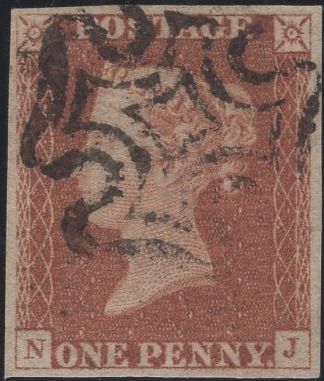 1841 1D RED PLATE 1B (SG7)(NJ). Very fine used 1841 1d red plate 1b (SG7) lettered NJ with fine four margins and fine strike black Maltese cross. Stamp clearly shows 7 and 10 o'clock ray flaws NW square and 'N RECUT' (Spec AS7e). (Ref 134929).