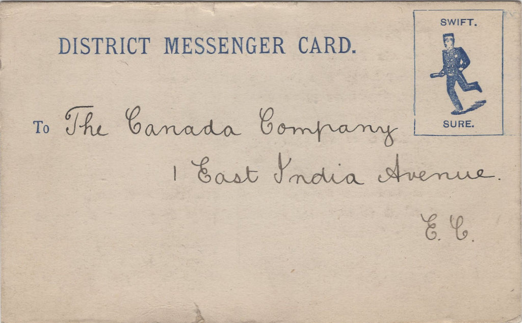 CIRCA 1890 'DISTRICT MESSENGER CARD' EX PRIVATE POST USED LOCALLY IN LONDON. A fine privately printed post card in blue, 120 x 75, used in London with imprint at top 'DISTRICT MESSENGER CARD.' and at upper right fine printed image of a stamp sized design depicting a running delivery boy with text 'SWIFT./SURE.' in blue. Card addressed to 'The Canada Company, 1 East India Avenue, E.C.' and fine printed message on reverse from the Directors of the 'District Message Company' informing the public that due to 'the extremely heavy royalties imposed upon their business by the Post Office, they have made arrangements to supply TICKETS FOR THE OPERA, THEATRES, AND ALL ENTERTAINMENT at all their Offices....'. Most unusual. (Ref 134959).