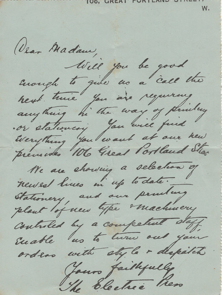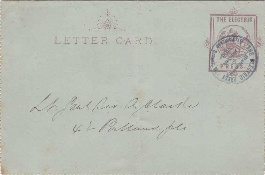 CIRCA 1890 'THE ELECTRIC PRESS' PRIVATE POST USED IN LONDON. A good to fine privately produced 'LETTER CARD' used in London and delivered by hand, at upper right fine image of a 'stamp' with imprint 'THE ELECTRIC PRESS' and within fine printed image of a printing press. The printed letter being an advertisement from 'The Electric Press' to promote stationery and printing at their premises Great Portland Street. Vertical filing fold but a rare example of presumably illegal privately delivered mail. (Ref 134960).