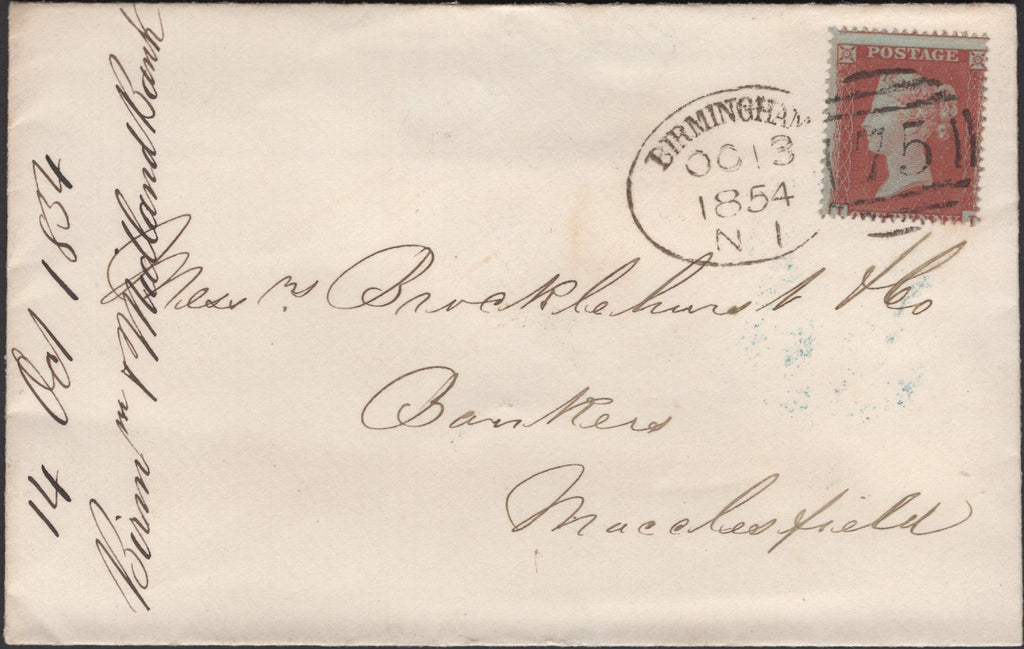 1854 BANKING ENVELOPE BIRMINGHAM TO MACCLESFIELD WITH DIE 1 1D PL.187 (SG17) AND BIRMINGHAM SPOON (RA2). Fine clean banking envelope Birmingham to 'Messrs. Brocklehurst and Co, Bankers, Macclesfield' with die 1 1d pl.187 S.C.16 (SG17) lettered IJ, centred slightly low but tied very fine strike 'BIRMINGHAM/75' spoon type A1 (RA2) OC 13 1854 codes N1. On reverse 'MACCLESFIELD' date stamp OC 14 1854 and on inside reverse flap printed banking receipt from 'BIRMINGHAM AND MIDLAND BANK'. (Ref 135453).