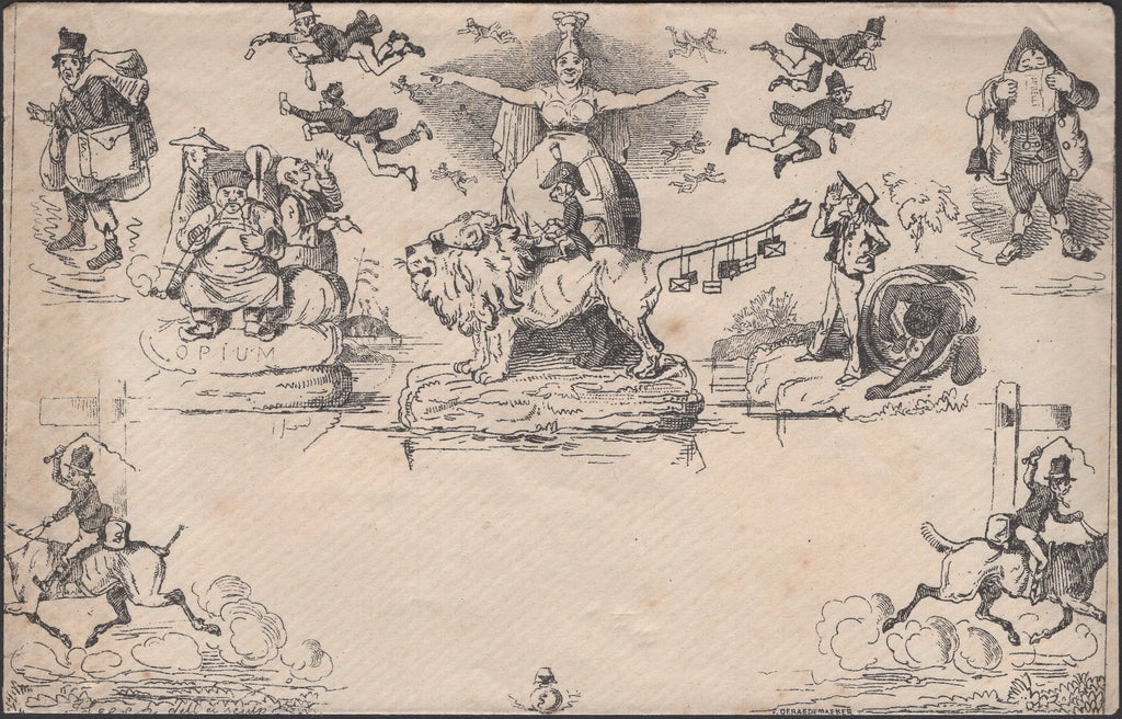CIRCA 1890 'FORES'S COMIC ENVELOPE NO.1' BY LEECH DERAEDEMAEKER RE-PRINT. A good unused circa 1890 Deraedemaeker re-print of 'Fores's Comic Envelope No.1', small repaired tear at top, in black on white wove paper. Caricature depicts Britannia despatching her messengers, the lion with an eye patch and with a monkey on his back in uniform with a cocked hat. At left references to China and opium, at right a planter with negro attending to a cask and at lower left and right are post boys making haste. (Ref 135459).