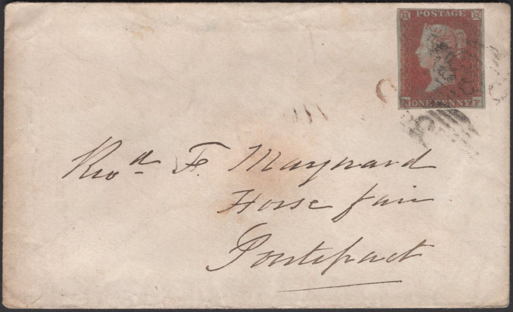 1850 MAIL TO PONTEFRACT WITH 1D PL.95 (SG8)(NF). Envelope to 'Revd. F. Maynard, Horsefair, Pontefract' with fine used 1d pl.95 (SG8) lettered NF, tied indistinct numeral. On reverse 'PONTEFRACT' date stamp MY 10 1850. (Ref 135477).