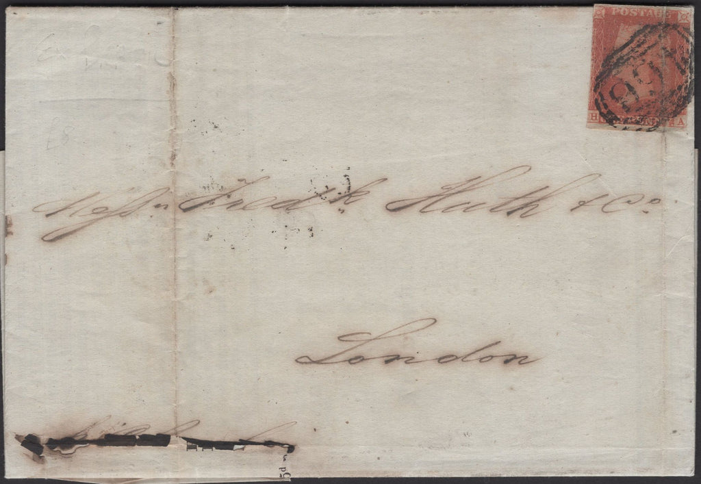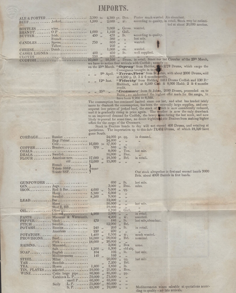 1844 PRINTED MATTER EX PERNAMBUCO, BRAZIL TO LONDON. Wrapper from Pernambuco May 30th 1844 to Huth of London, ship name at lower left erased and acidic ink has damaged paper, with fine printed contents concerning 'IMPORTS' and 'EXPORTS' with references to Beef, Brandy, Codfish, Copper, Gin etc etc arriving Liverpool with 'LIVERPOOL' date stamp JY 4 1844 and 1d (SG8) affixed for postage to London. Crease affects stamp. (Ref 135536).