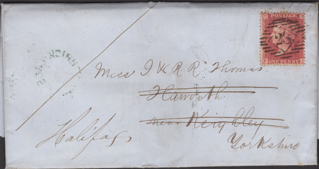 1858 MAIL LONDON TO KEIGHLEY, YORKSHIRE, RE-DIRECTED TO HALIFAX WITH 'BRICK-LANE' UDC. Fine entire letter from 'Brewery Spitalfields' dated 8th June 1858 to 'Miss J K R R Thomas, Haworth, near Keighley, Yorkshire' with good die 2 1d rose-red on white paper (SG40) lettered FI tied fine strike London '28' Inland Office numeral. Letter re-directed to Halifax with manuscript charge '1'. On reverse good to fine strike 'BRICK-LANE' smaller udc in dark blue, 'LONDON' date stamp JU 8 58 and 'KEIGHLEY' date stamp JU 9 58. Good usage. (Ref 135550).