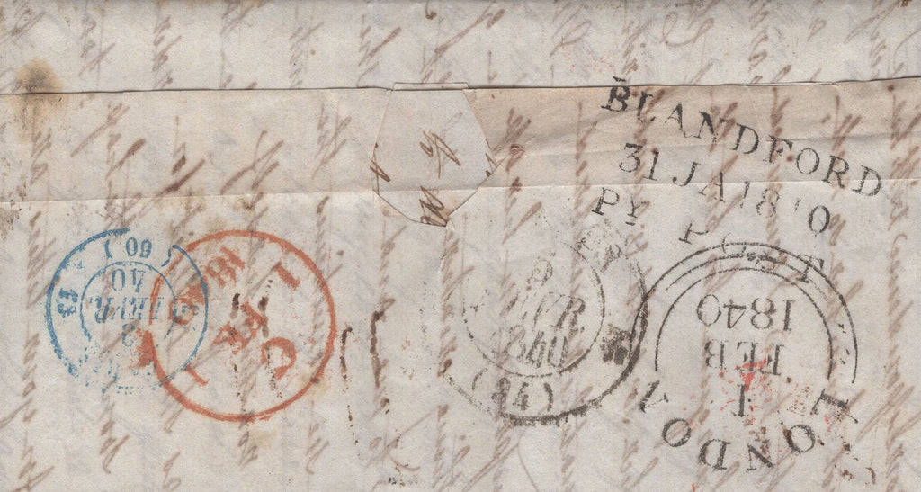 1840 MAIL SPETISBURY, DORSET TO RENNES, FRANCE WITH VARIOUS CHARGE MARKS AND HAND STAMPS. Fine entire letter from 'Spetisbury House' in Dorset dated January 31st 1840 to Rennes in Brittany, France, on front various charge marks. On reverse fine strike 'BLANDFORD/31 JA 1840/PY POST' hand stamp in black, 'LONDON' Foreign Office date stamp 1 FEB 1840 and 'PARIS' date stamp in blue 3 FEVR 40. Fine usage. (Ref 135577).