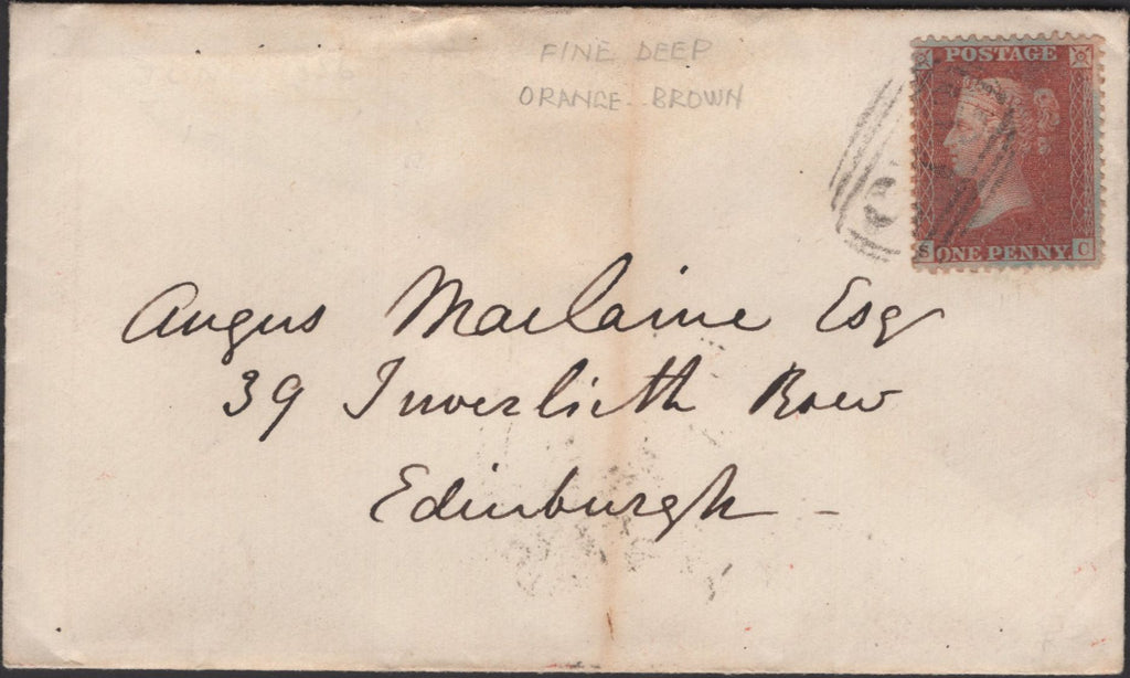 1856 MAIL THORNBURY, GLOS TO EDINBURGH WITH DIE 2 1D PL.32 DEEP ORANGE-BROWN (SG33)(SC). Fine envelope from Thornbury in Gloucestershire to 'Angus Maclaine Esq, 39 Inverleith Row, Edinburgh' with very fine die 2 1d pl.32 lettered SC in an unusual DEEP ORANGE-BROWN SHADE (SG33 Spec C8(5) and tied light strike '315' numeral of Thornbury. On reverse 'THORNBURY' date stamp JU 30 1856. Ex Alcock. (Ref 135594).