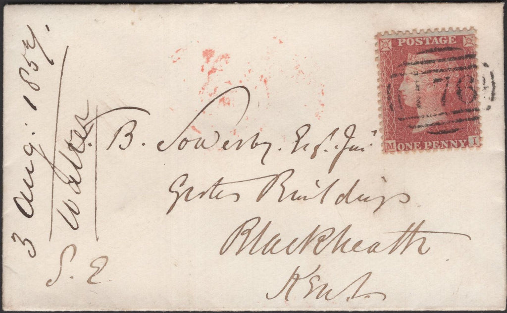 1857 MAIL CHELMSFORD, ESSEX TO BLACKHEATH WITH DIE 2 1D PL.37 (SG29)(MI). Fine envelope Chelmsford to Blackheath with fine die 2 1d pl.37 red-brown on very lightly blued paper (SG29) lettered MI tied fine strike '176' numeral of Chelmsford. On reverse 'CHELMSFORD' date stamp AU 3 1857. Fine usage. (Ref 135597).