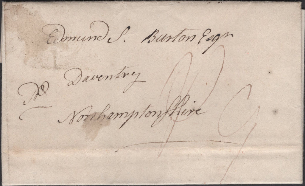 1832 MAIL DALHAM, SUFFOLK TO DAVENTRY WITH 'NEWMARKET' CIRCULAR MILEAGE MARK (SK282). Entire letter, slight soiling, from Dalham to 'Edmund S. Burton Esqr, Daventry, Northamptonshire' with manuscript 'P9' and on reverse very fine strike 'NEWMARKET' circular mileage mark with mileage erased (SK282) in red. Letter dated Jan 19 1832. (Ref 135667).