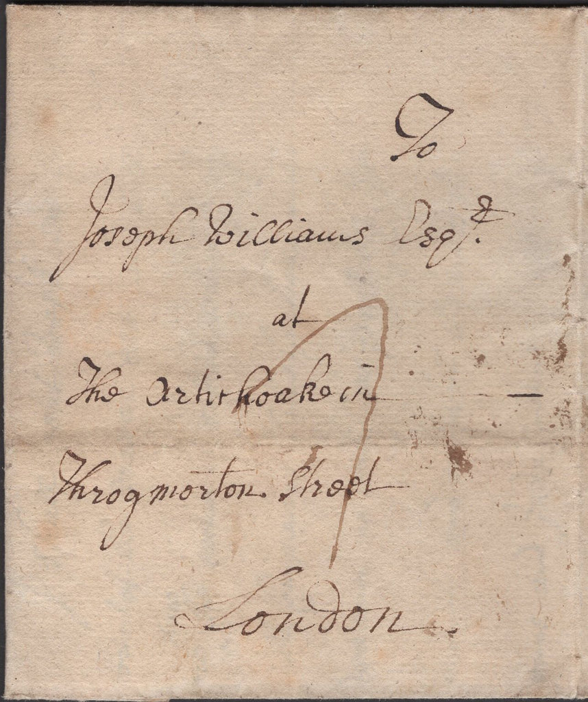 1737 MAIL NEWMARKET TO LONDON WITH 'NEW/MARKET' TWO LINE HAND STAMP IN BLACK (SFK488). Fine letter from Newmarket dated Dec 29 1737 'To Joseph Williams Esq, at The Arhihoake in Throgmorton Street, London', on reverse good strike 'NEW/MARKET' two line hand stamp in black (SFK488). Also on reverse London Bishop mark '30/DE'. Tom Slemons records the Newmarket hand stamp 1733-1739, rare early usage of a provincial hand stamp. (Ref 135669).