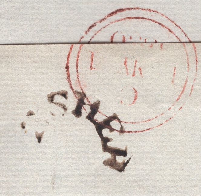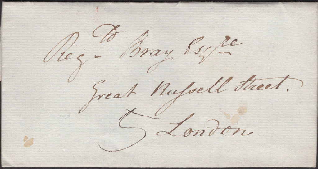 1830 MAIL ESHER, SURREY TO LONDON WITH 'ESHER' HORSESHOE HAND STAMP (SY265). Fine wrapper from Esher to 'Regld Bray Esq, Great Rufsell Street, London' charged '5', on reverse good to fine strike 'ESHER' horseshoe style hand stamp in black (SY265) and London date stamp 1 MY 1830. (Ref 135671).