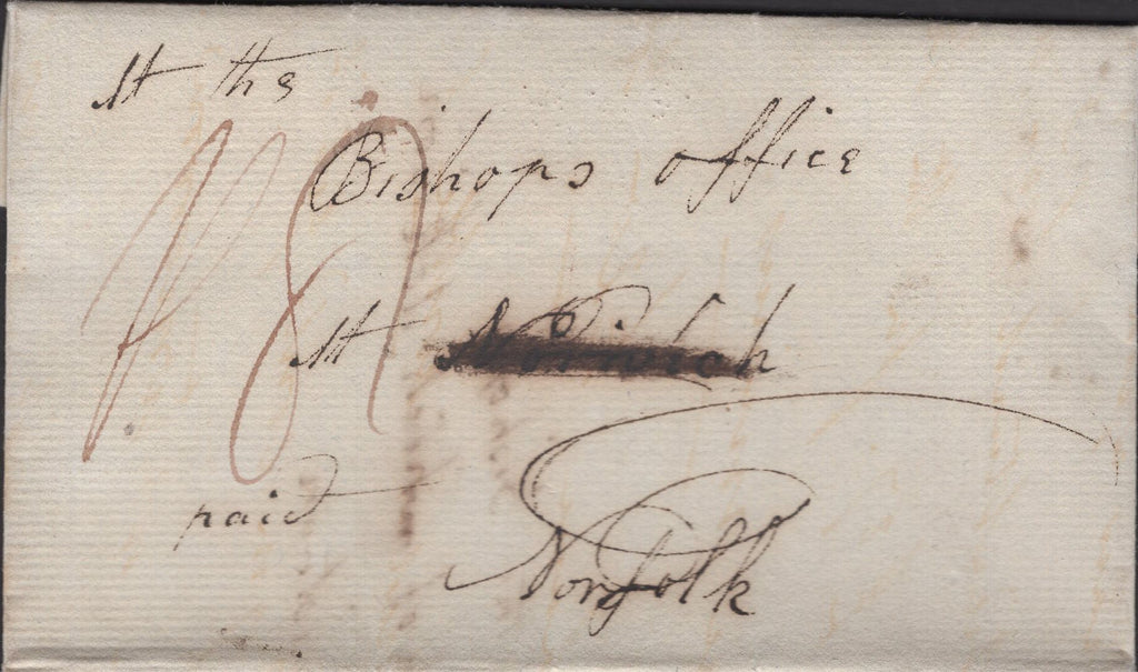 CIRCA 1832 MAIL NEWMARKET, SUFFOLK TO NORWICH WITH 'NEWMARKET' CIRCULAR MILEAGE MARK (SK282). Undated letter, circa 1832, from Newmarket to 'The Bishop's Office at Norwich, Norfolk' with part address erased with manuscript 'P8' and additional charge of '6', on reverse very fine strike 'NEWMARKET' circular mileage mark with mileage erased (SK282) in red. (Ref 135672).